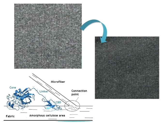 英联酶去毛球纤维素酶biotouch fcl75针对性分解这些伸展在外的纤维,去除毛球,并在多次洗涤后仍然保持衣物鲜亮的颜色。